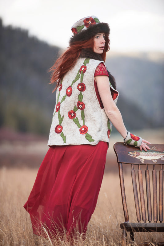 Poppies and Elk Antler Appliquéd Bison Trimmed Vest