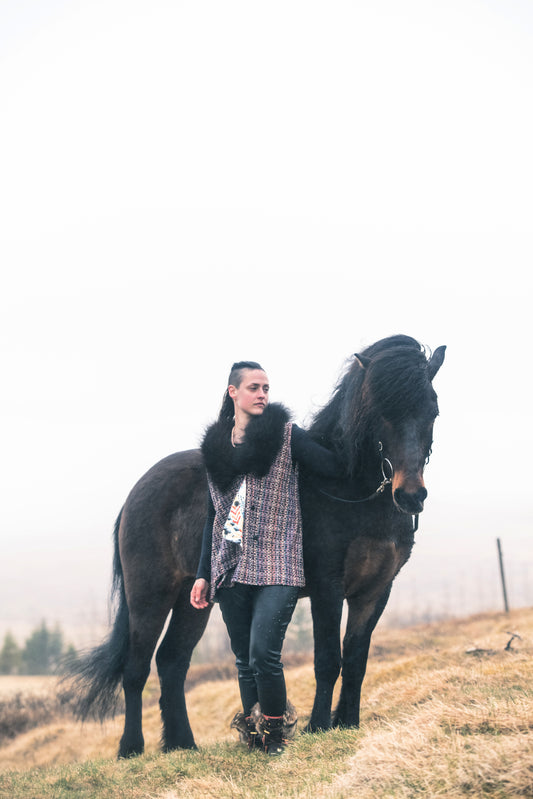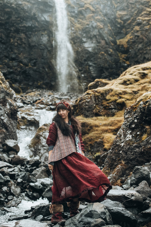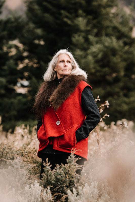 Vests are another fashion that allow bison to be showcased. Many wear vests on days when a coat or cape is too much coverage. Some wear vests year-round over skirts, dresses, and jeans. For me, it is another canvas to appliqué the flora and fauna of my western home, or to show off beautiful woven fabric. The fabric I choose usually announces itself and tells me what it wants to be. I also delight in bright unexpected linings that pop when the vest is left unbuttoned. I choose elk and deer antler buttons to accent designs as well, and to use as closures. Each piece speaks of authenticity and calls back to the landscape I love.