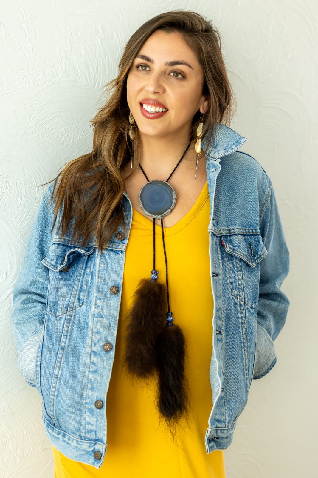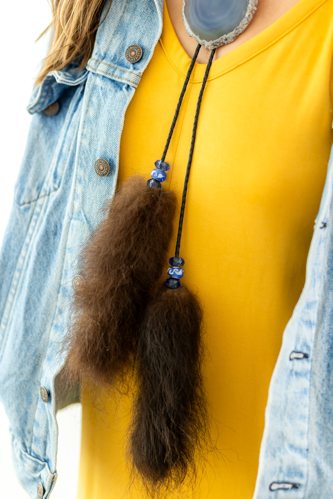 Handmade by Jennie Montana, Big Sky BIson Bolo blends Western tradition with natural artistry. Braided leather cord is paired with an easy-slide bolo clip, making it comfortable and adjustable for any fit. The centerpiece features a sliced treated quartz stone—accented with authentic bison tips for a bold finish. Perfect for dressing up or wearing casually, this bolo tie adds a touch of rugged sophistication to your look. A one-of-a-kind accessory that celebrates Western style, craftsmanship, and the spirit of Montana.