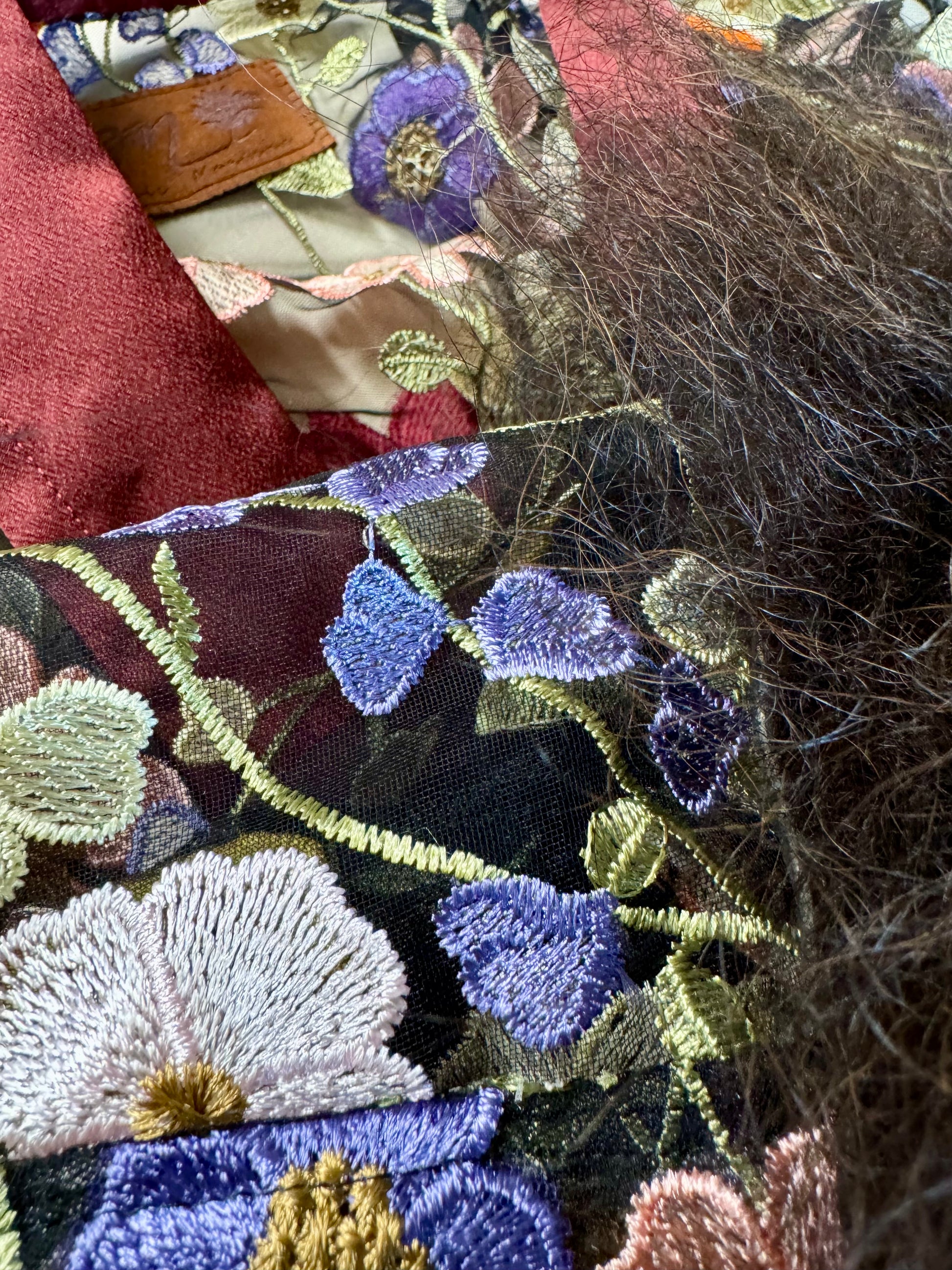 It's outragous! Total flower power. This duster is like falling into a spring mountain meadow. Large embroidered multi-colored flowers on a black tulle background, with pockets. The collar is a maroon satin. Jennie prepared and stretched the bison before having it tanned. She chose the best fluffiest bison to trim the collar of this one-of-a-kind piece.