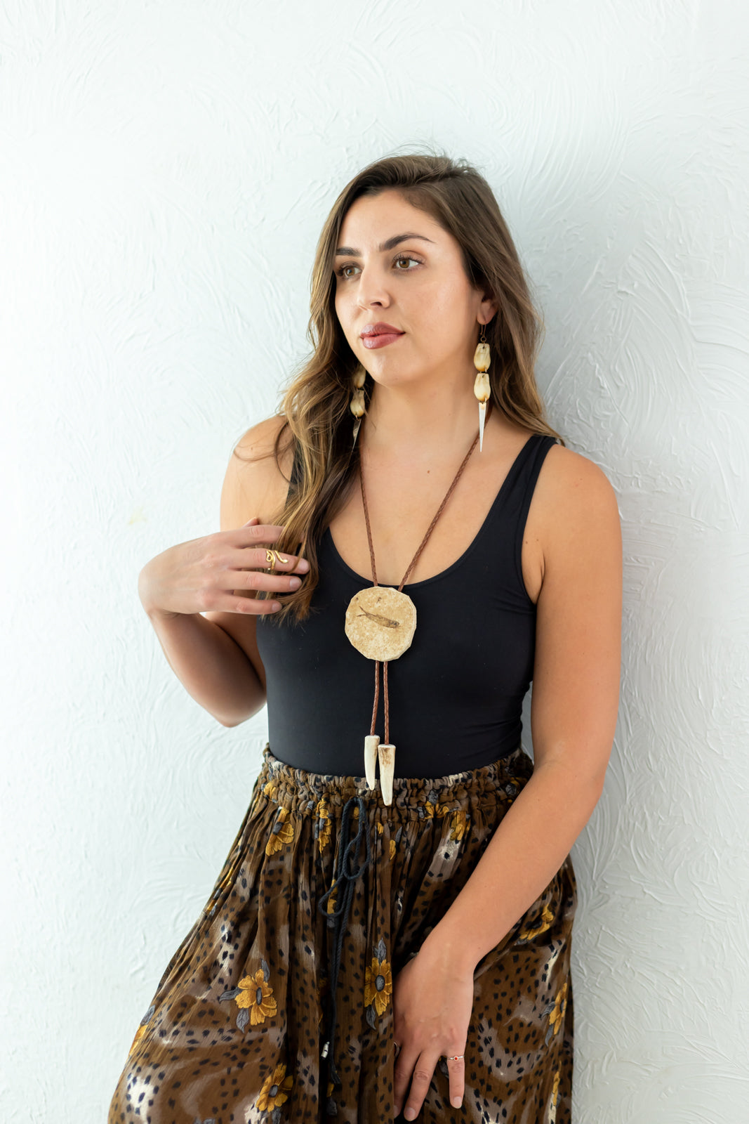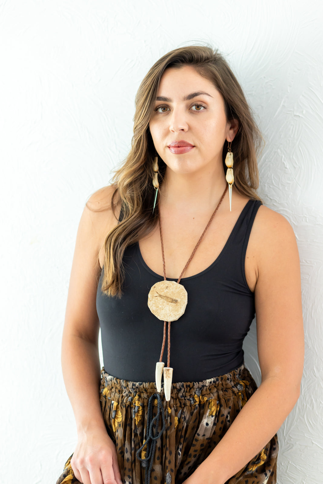Fish Fossil Medallion on Braided Leather Cord with Deer Tine Tips