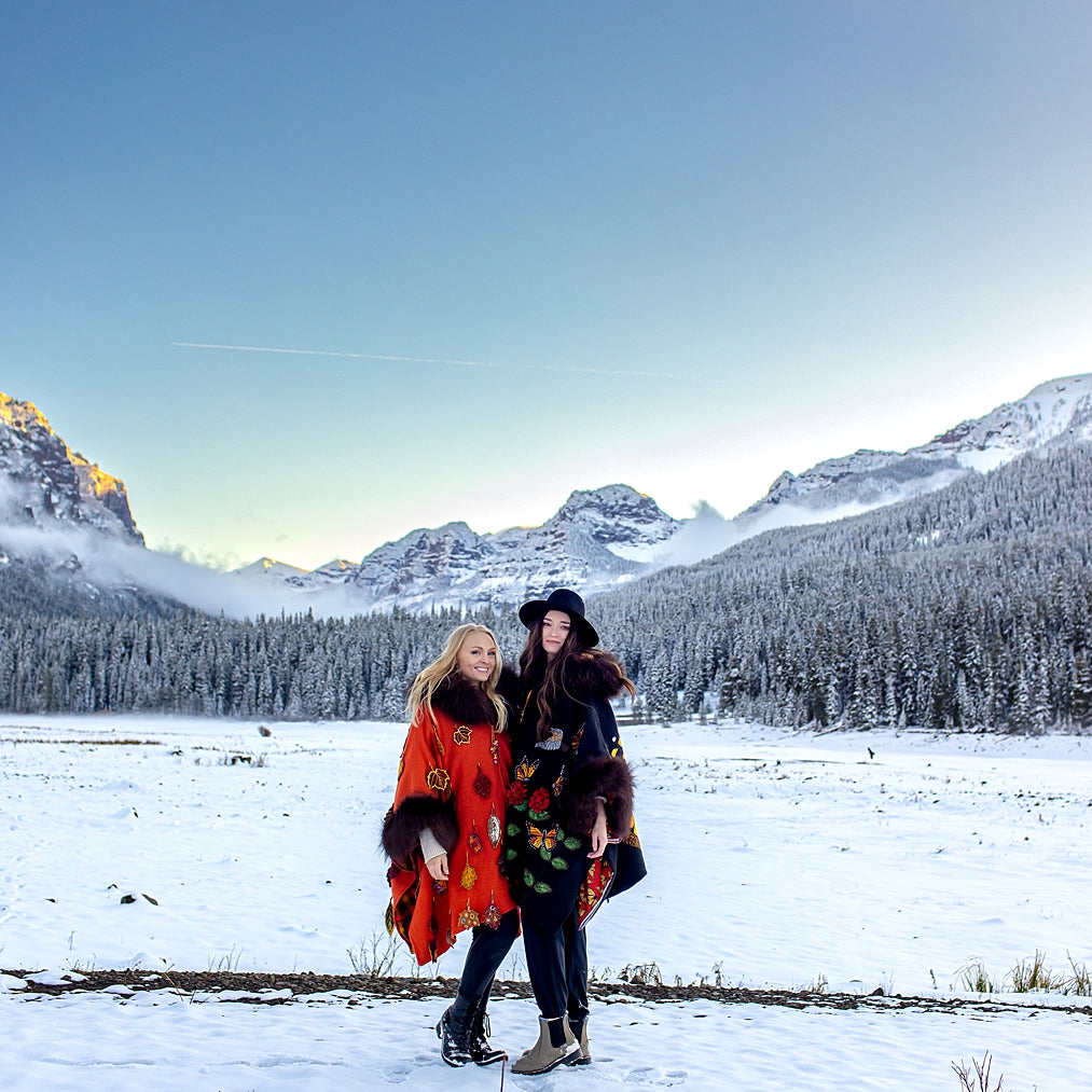 Embroidered wool with pearl-beaded edges, cotton lining, inside leather pocket, and bison-trimmed collar and cuffs.