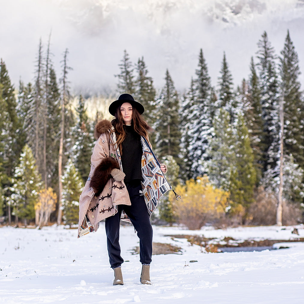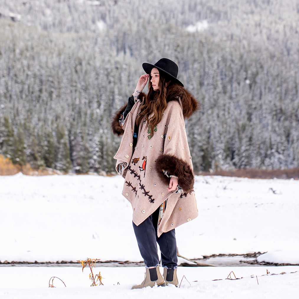 Jennie prepared and stretched the bison before having it tanned. She chose the best fluffiest bison to trim the cuffs and luxurious hood for this one-of-a-kind piece.