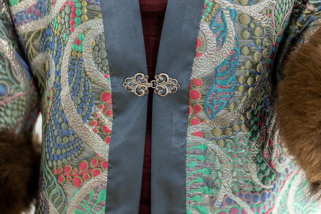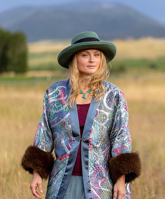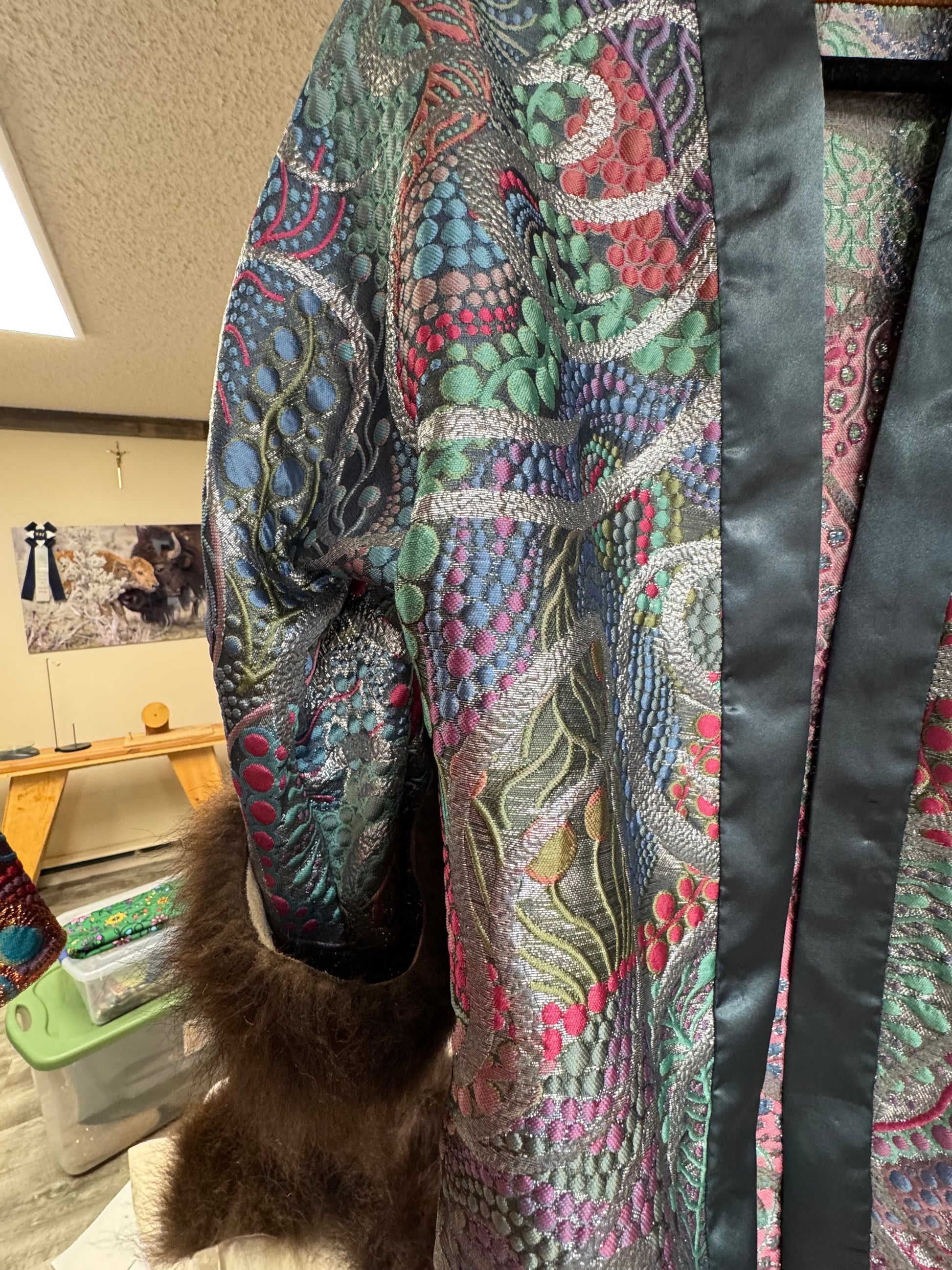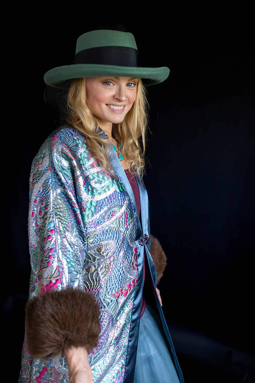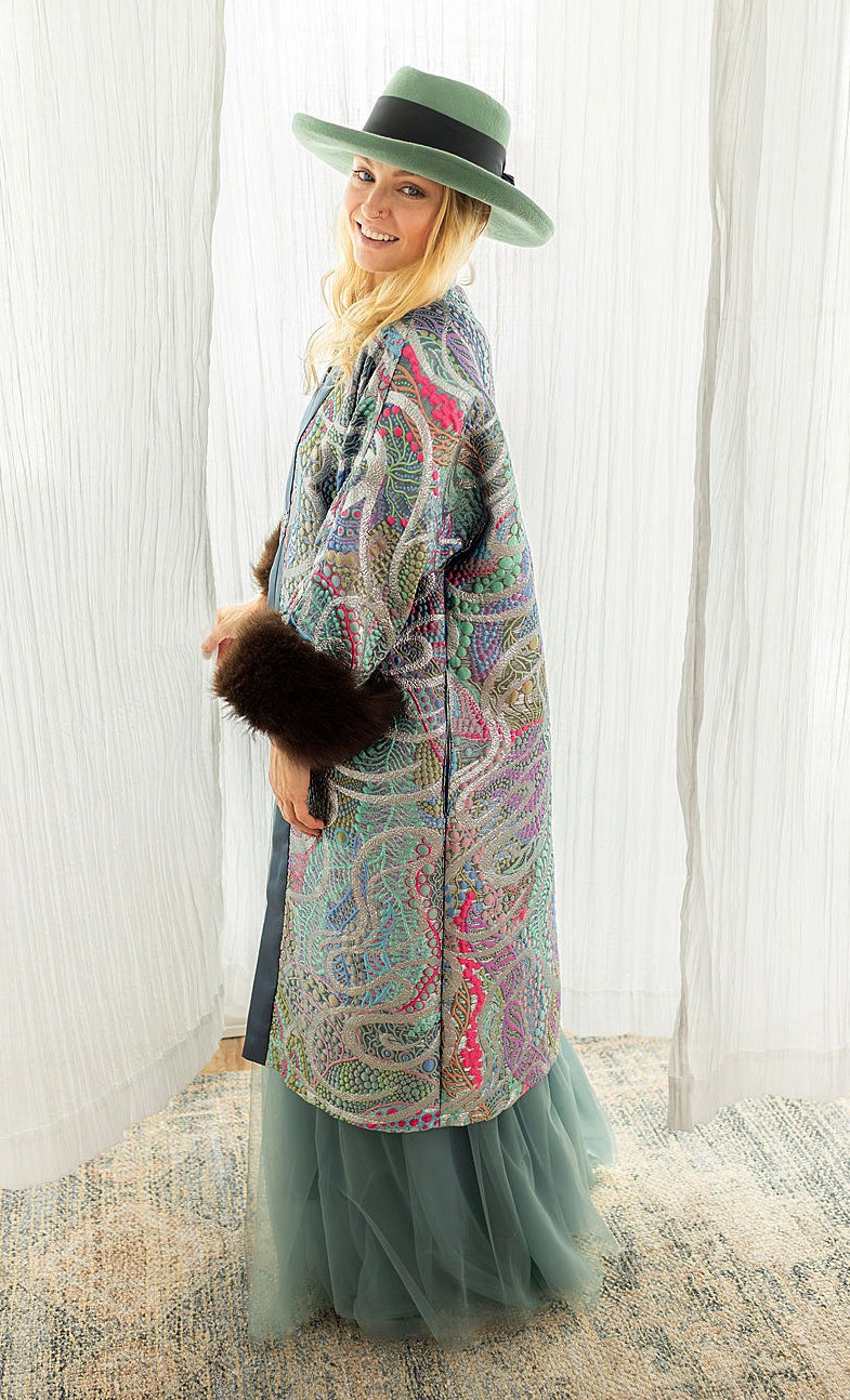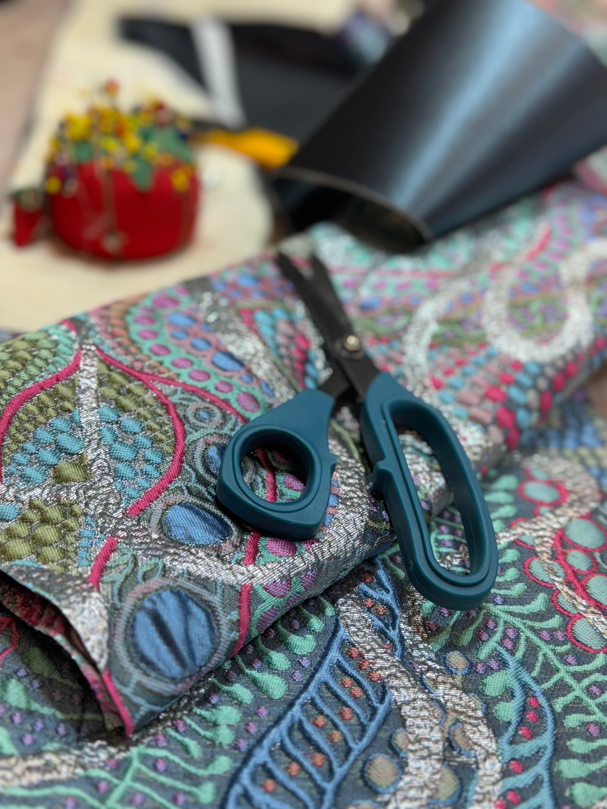 She wanted something unforgettable—for the wedding, for the gallery, for the moment she walked into the room. A shimmering brocade in sky tones.