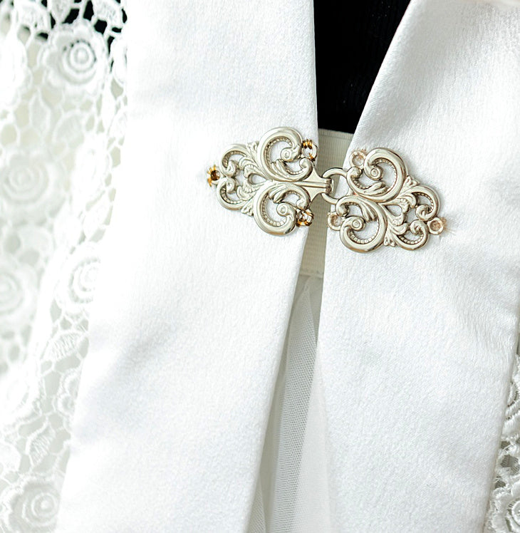 This white lace kimono-style duster drapes like a soft whisper, moving effortlessly from wild landscapes to candlelit rooms. A luminous satin collar and cuffs, each edged in velvety bison trim, frame the intricate lace with quiet luxury. The heirloom filigree clasp at the front and discreet seam pockets blend beauty with purpose. Perfect for the bride who loves the open sky, for a gala under glittering lights, or as the graceful cover to a gown—where Western spirit meets timeless elegance.