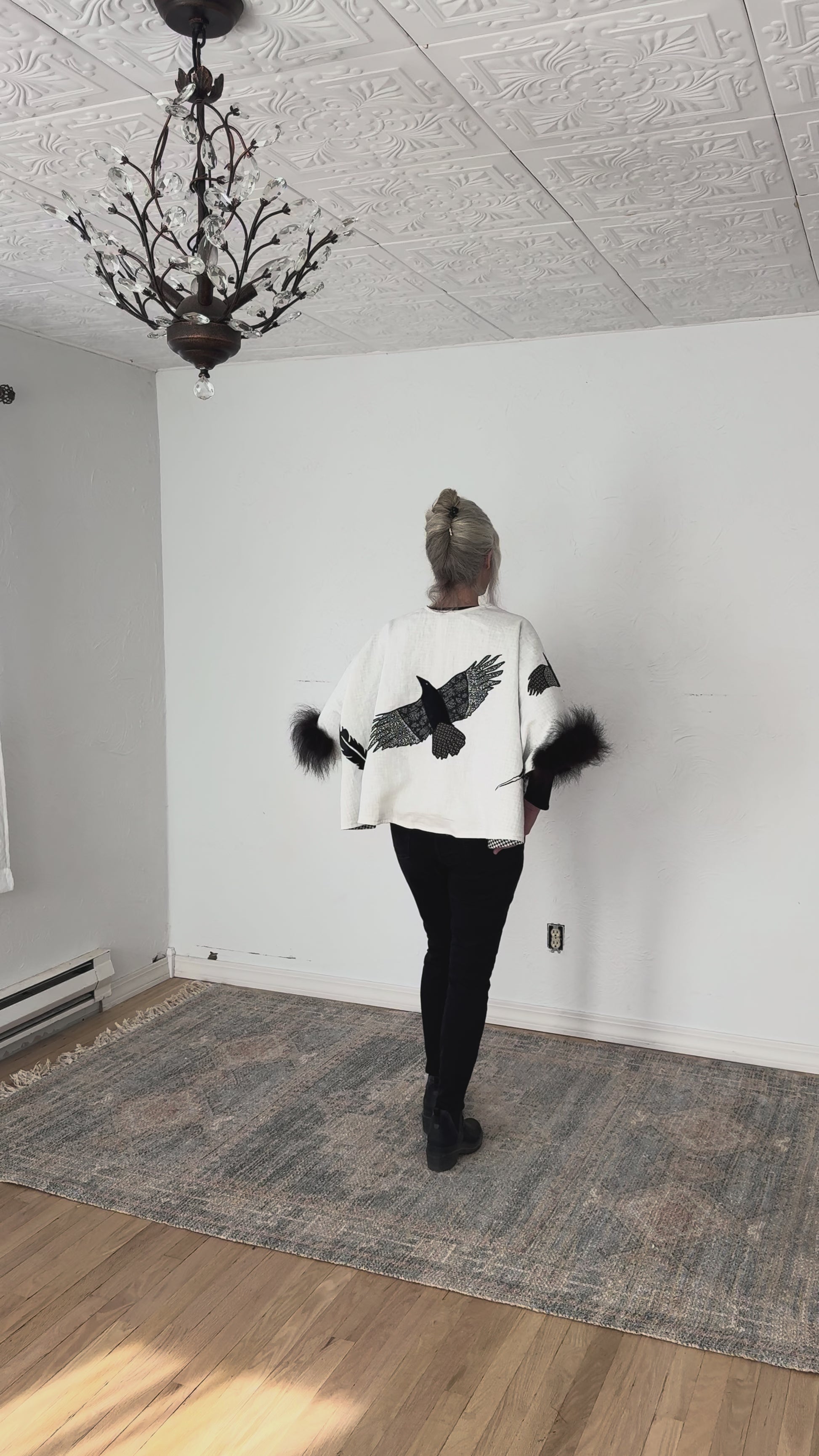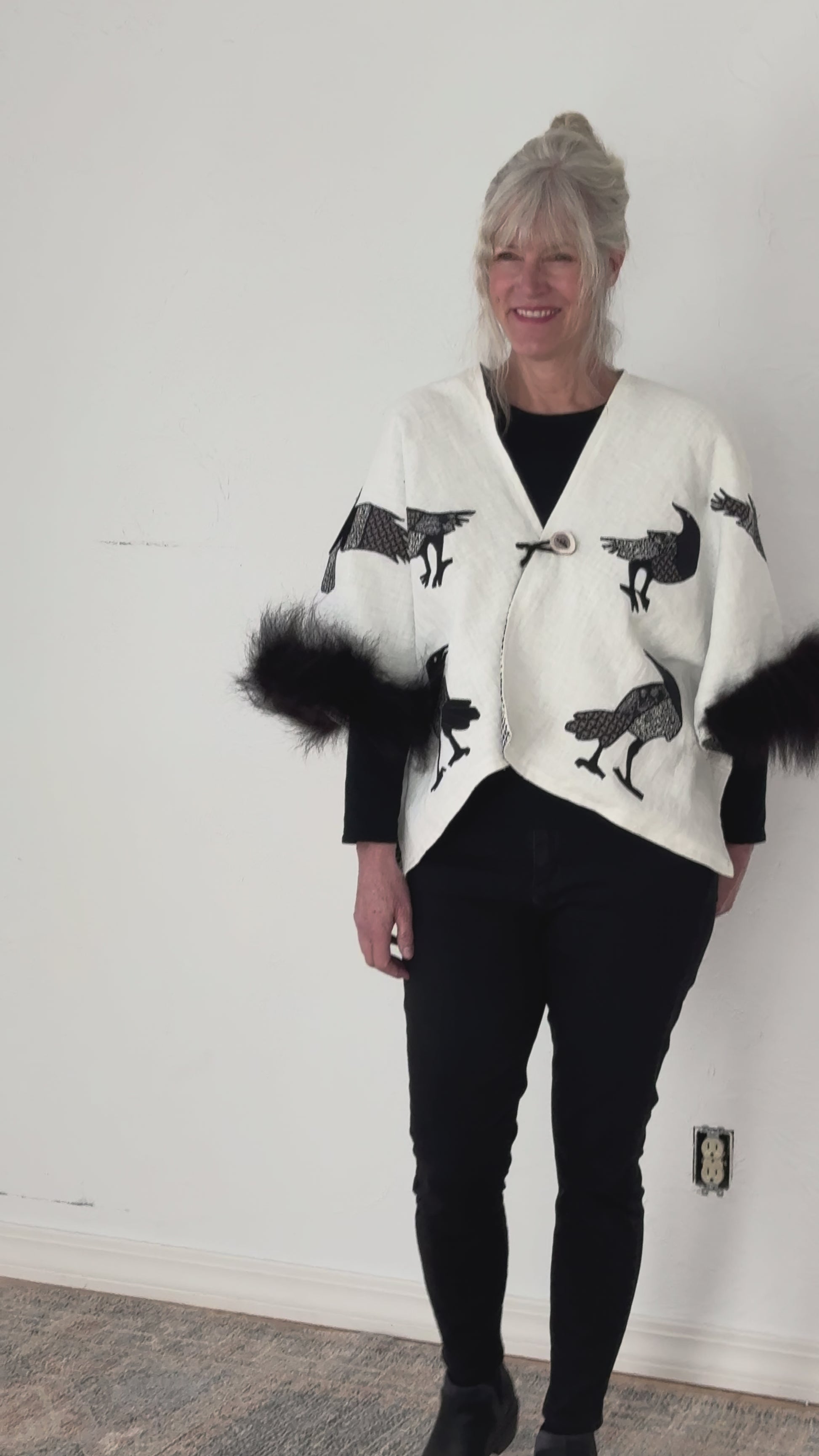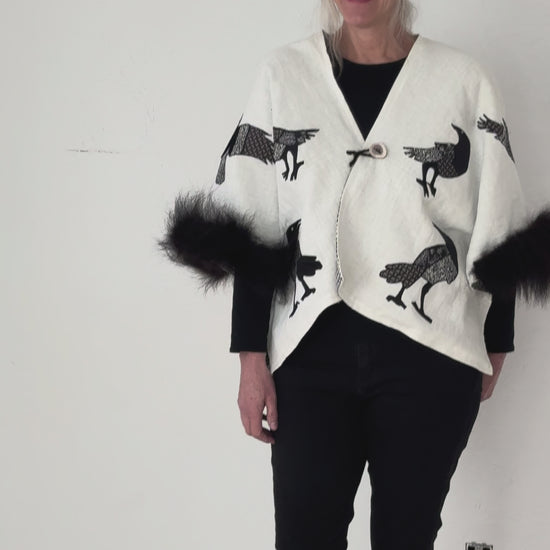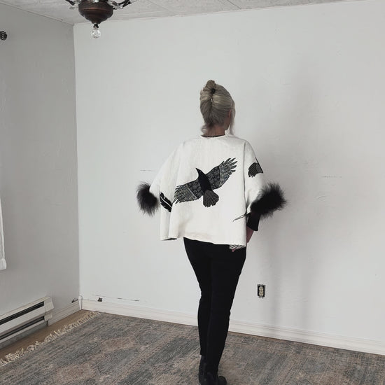 Originating from folklore, telling the crows meant to keep them informed of life events, ensuring they remained protectors. As corvids, crows are highly intelligent and can remember faces. The crows in Jennie Montana's backyard remember she has stretched bison hides each January and they flock to her home and yard regularly. She is delighted by their friendly caws and comical busy bantering. This bison trimmed 100% natural linen capelet is has a flock of friendly appliquéd crows. The lining is a 100% cotton in a houndstooth pattern. Inside, a hidden leather pocket is sized to fit a cell phone, a small wallet, car keys, or a love note! A deer antler button closes the front with a knitted bison yarn loop. The capelet is easily dry cleaned. Great for over jeans, dresses, or special events. Pair it with a hand-painted silk scarf by, Svitlana Prouty, custom designed for this collection. A unique one-of-a-kind piece you will treasure and wear through the seasons.