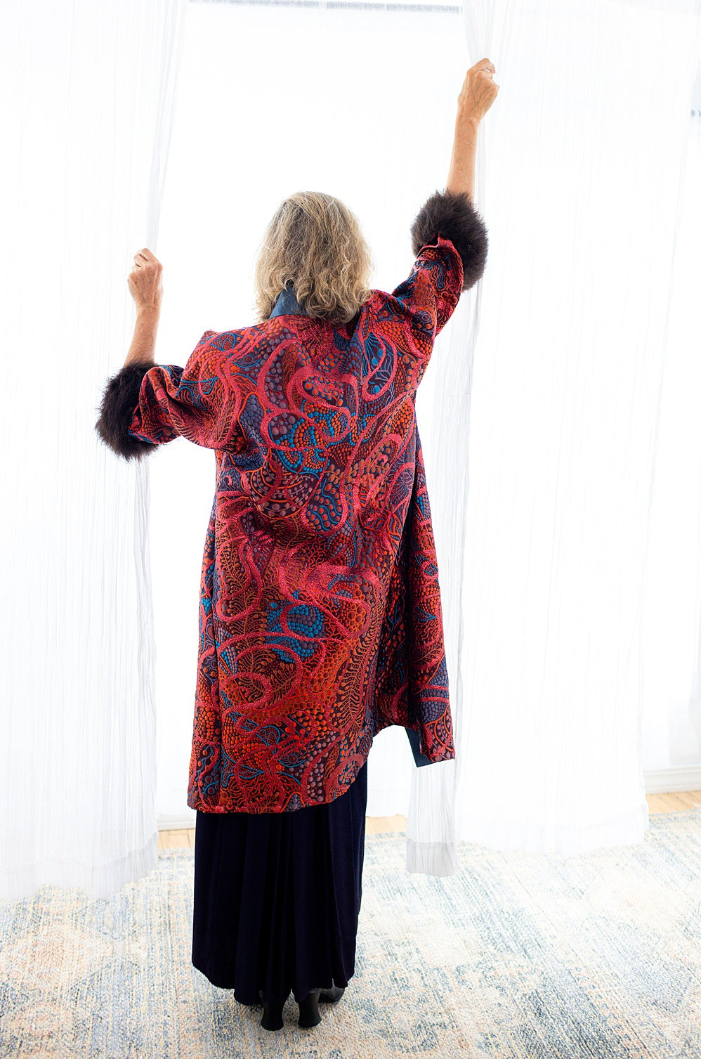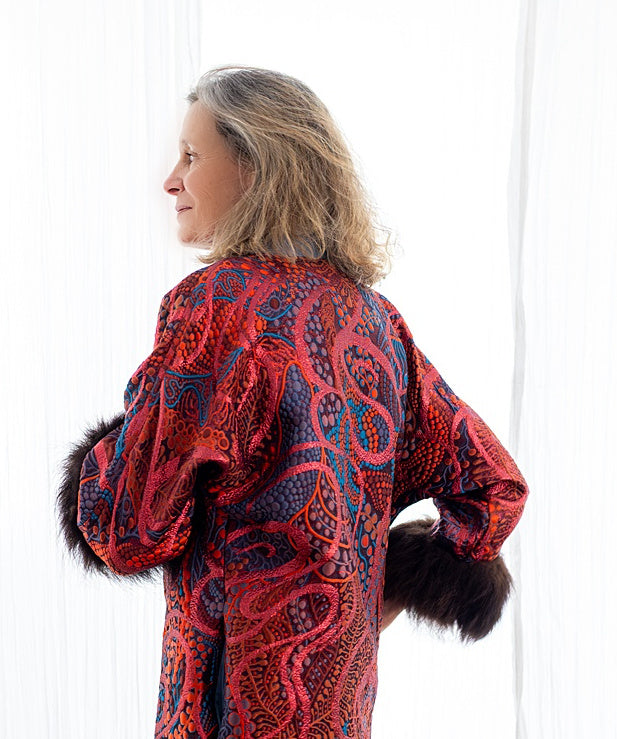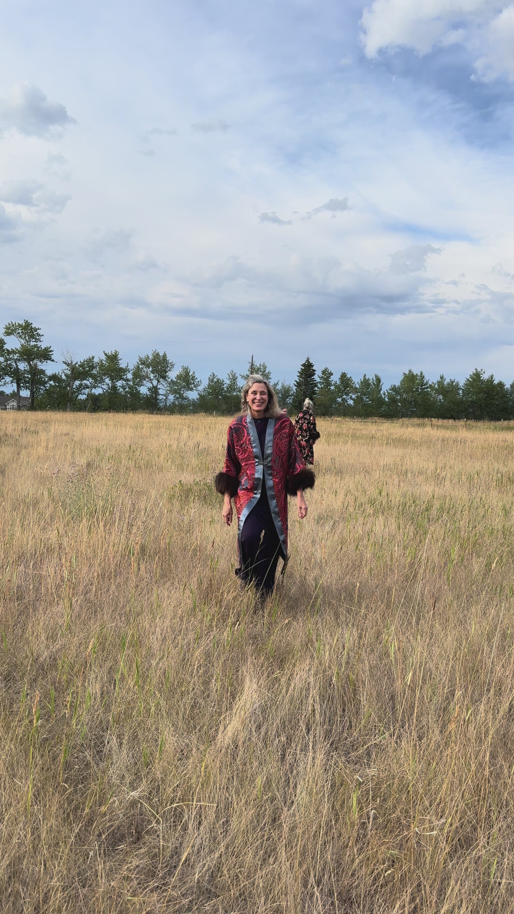 A shimmering brocade kimono-style coat, luxuriously trimmed at the cuffs in rich bison and finished with a smooth satin collar, exudes both refinement and presence. Fastened with a delicate filigree metal closure, it blends artistry with function, complete with discreet seam pockets for modern ease. Recently featured in the, Cowboys & Indians - Fall Fashion Issue 2025.