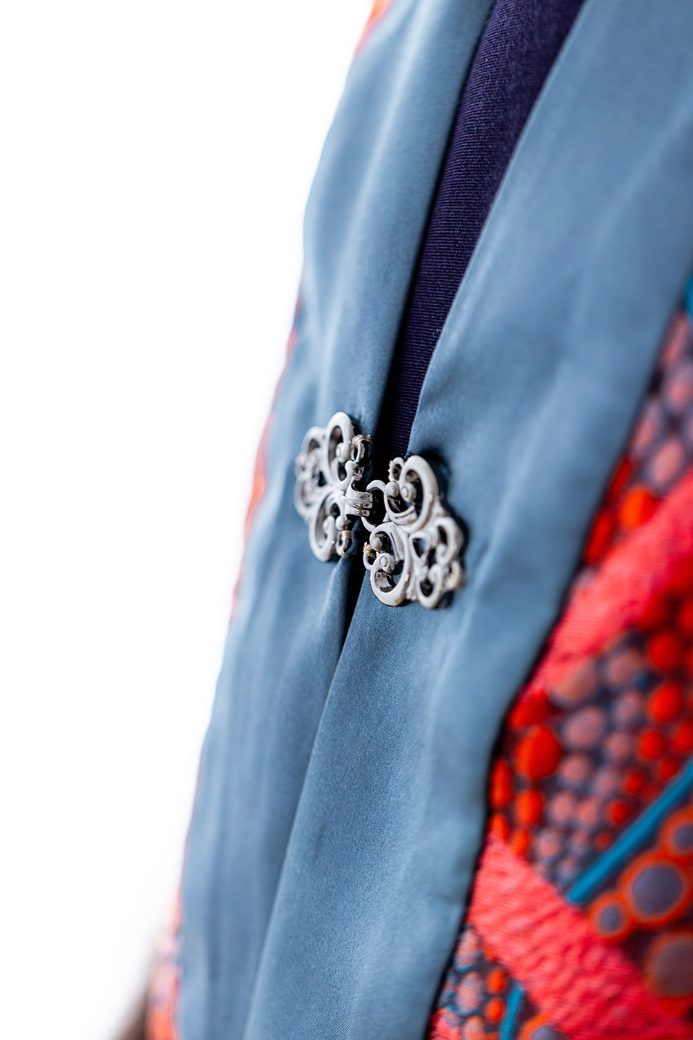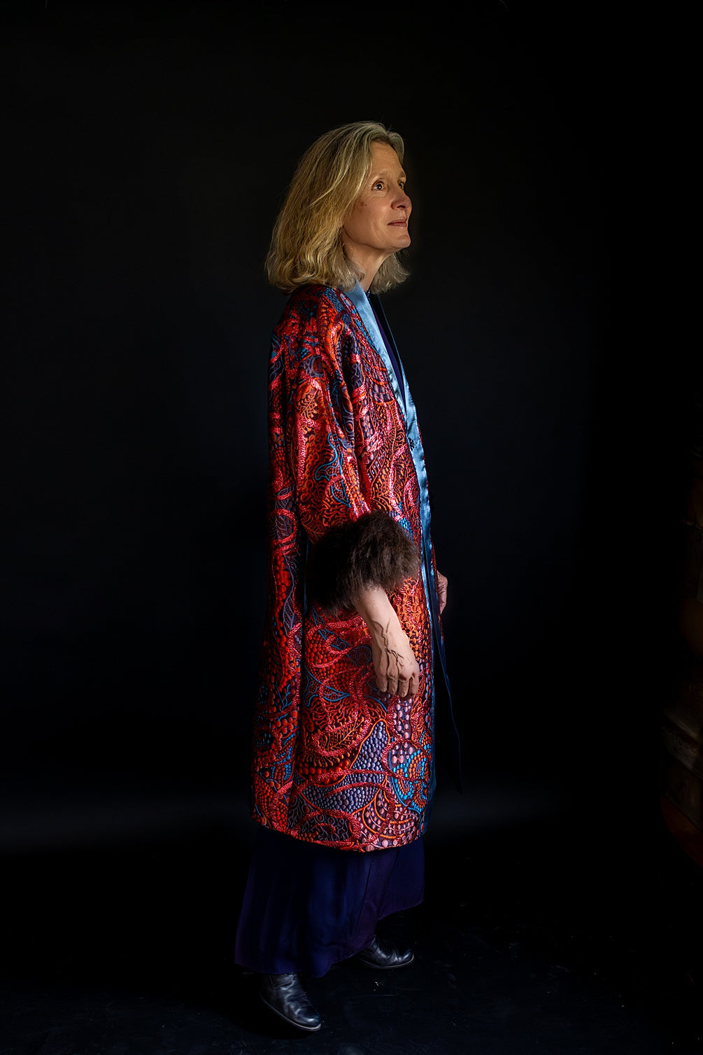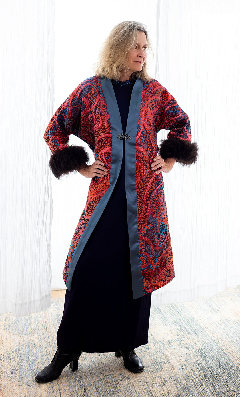 A shimmering brocade kimono-style coat, luxuriously trimmed at the cuffs in rich bison and finished with a smooth satin collar, exudes both refinement and presence. Fastened with a delicate filigree metal closure, it blends artistry with function, complete with discreet seam pockets for modern ease. Recently featured in the, Cowboys & Indians - Fall Fashion Issue 2025.