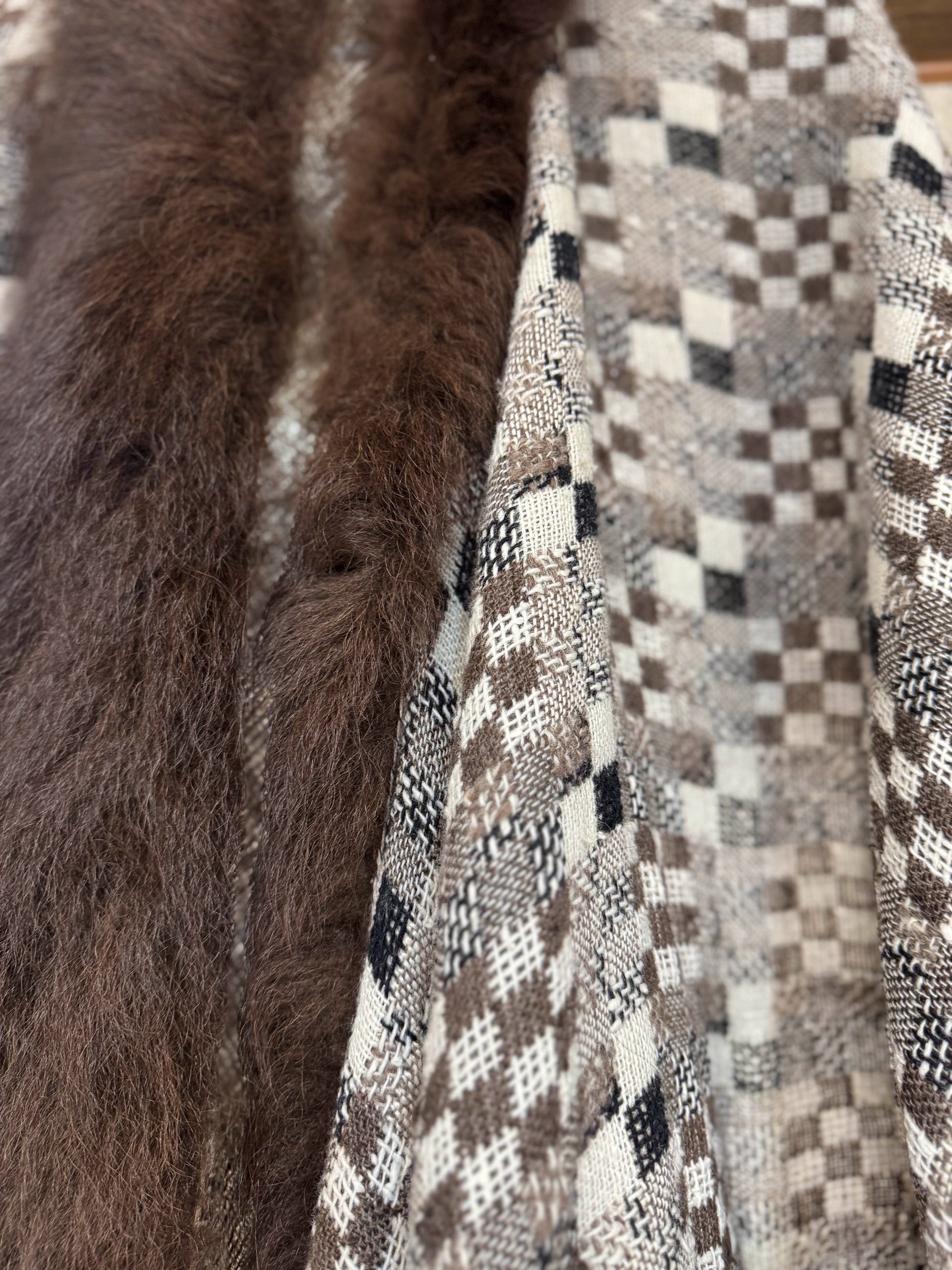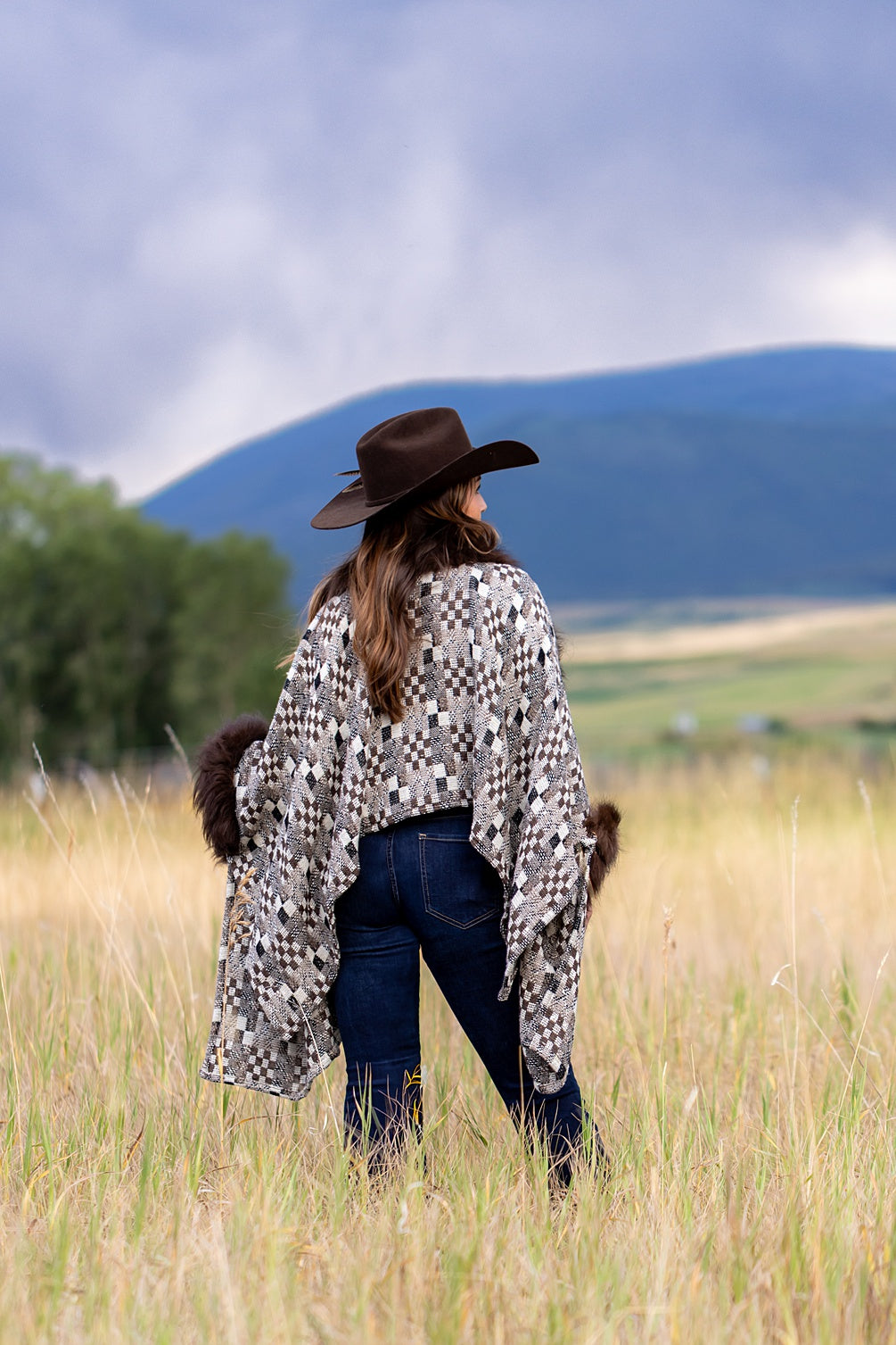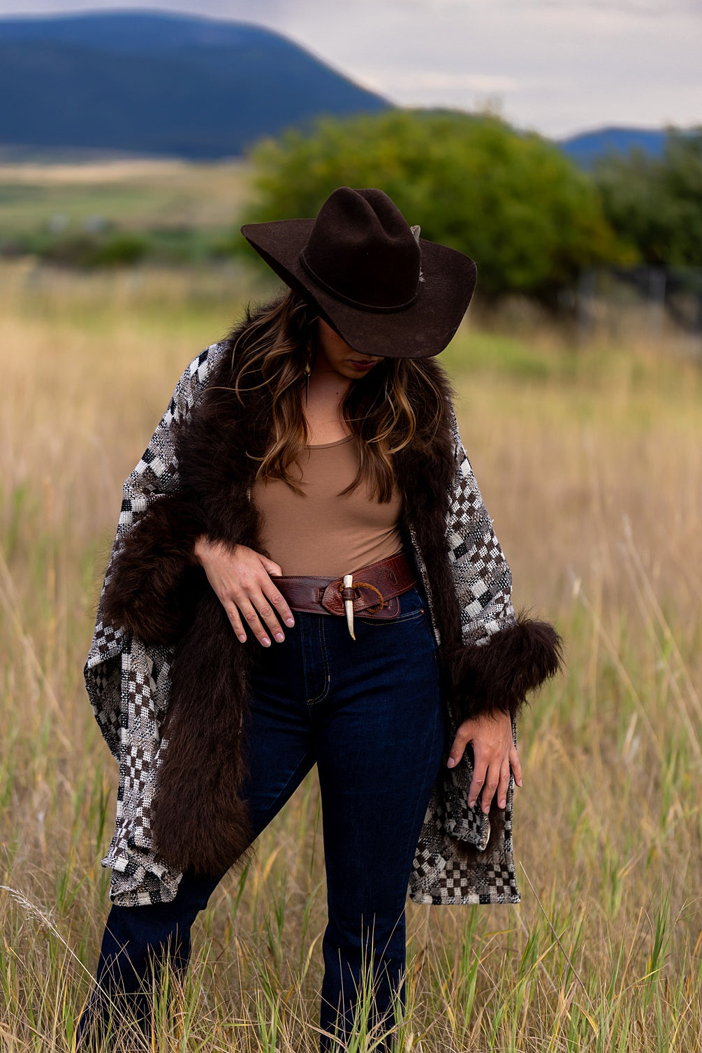 This designer-woven wool poncho, trimmed in luxuriously soft bison, is made for everyday wear. Dash out the door in jeans to the farmer’s market, or dress it up for a local play at the downtown theater. Timeless, versatile, and distinctly Western—this is a piece you’ll reach for all season long. Western warmth. Effortless style.